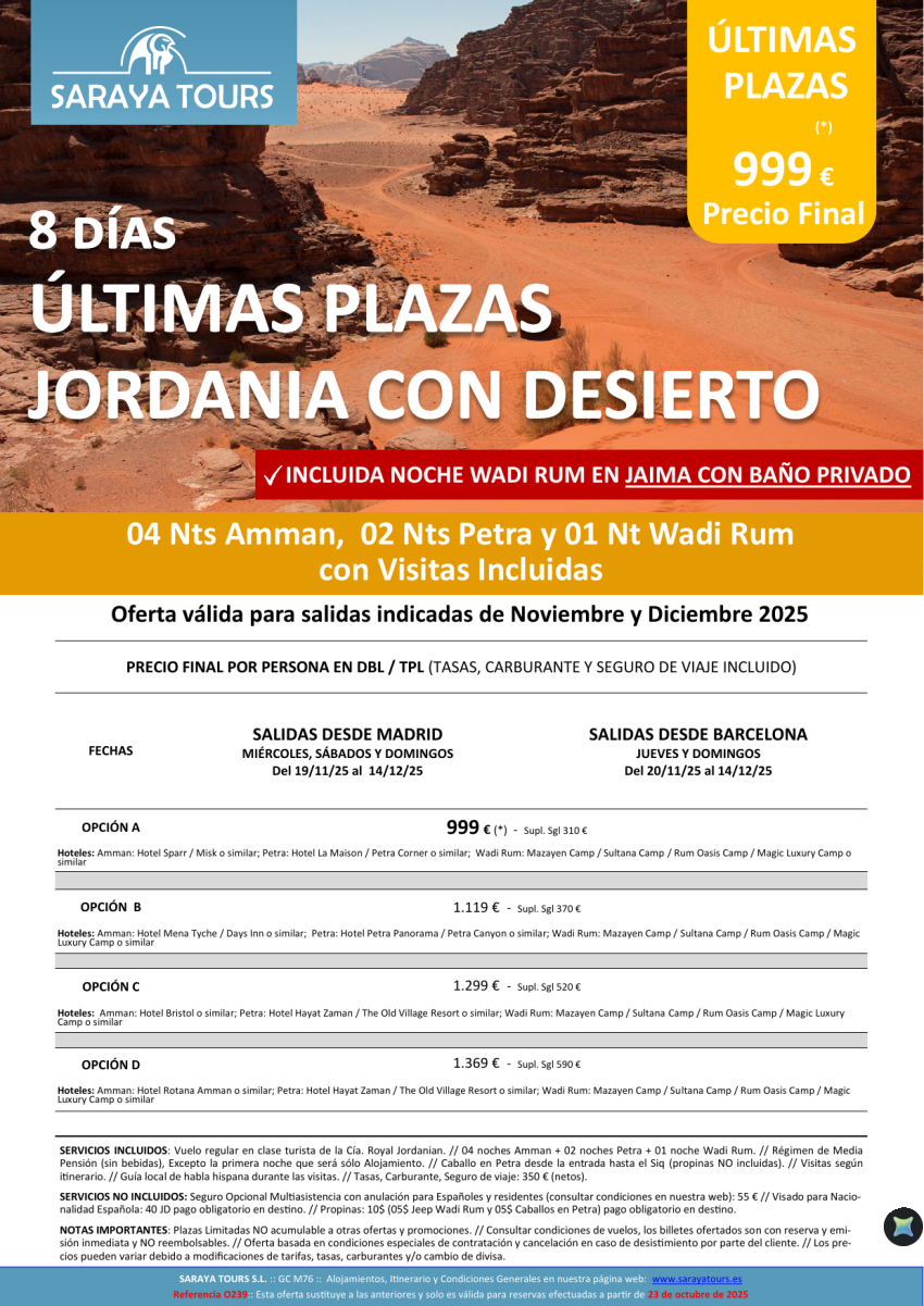 Últimas Plazas Jordania con Desierto 8 días. Circuito Amman, Petra y Desierto con visitas. Plazas limitadas.