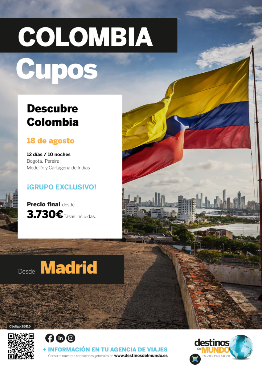 🇨🇴💫Descubre Colombia CUPOS 12 días / 10 noches origen: Madrid salida: 18 de Agosto de 2026 desde 3.730€ 💫